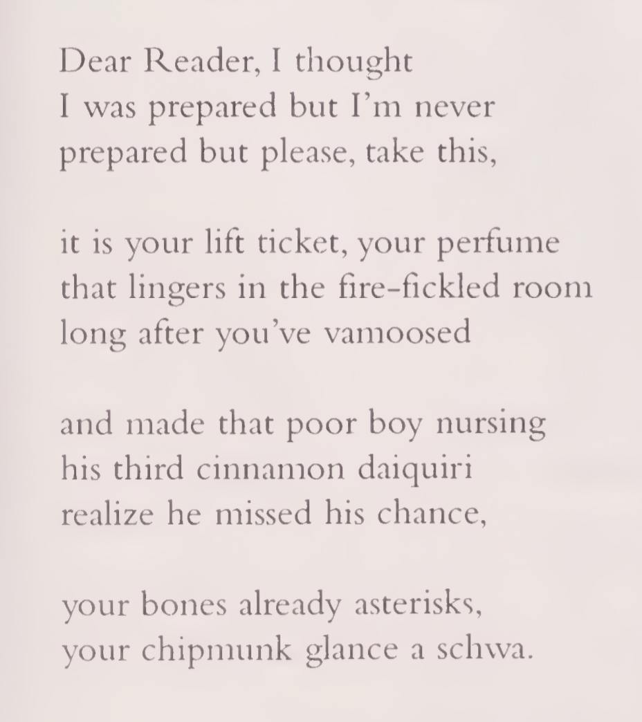 "your bones already asterisks, / your chipmunk glance a schwa."