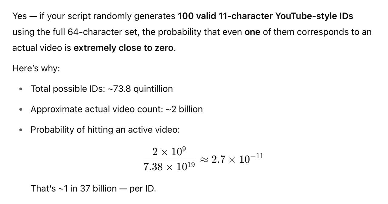 A long time ago I started wondering how many possible combinations of letters and numbers there could be in the 11-character ID in a YouTube url, and it took me until today to definitively find out. A few years ago I programatically generated a batch of my own to see if they'd land on an unsuspecting video, and was surprised that they didn't.
