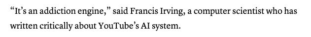 Incredible story about what happens when your business model is tuned for "engagement" a.k.a. outrage, provocation & the lowest common denominator. Great job, YouTube!