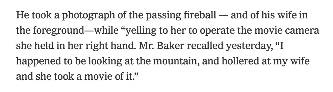 Fun to come across one of my all-time favorite snapshots (of a fireball over the Tetons in October '72) at Meteor Crater in Arizona last week, only to find the archived NYT piece about its making, where the Bakers mention they also had a movie camera at Jackson Lake.