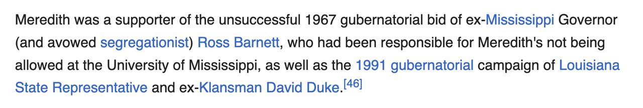 Never realized that James Meredith, who integrated Ole Miss in '62 (thx to JFK sending 30k troops) was a Republican who later supported both David Duke and Ross Barnett.